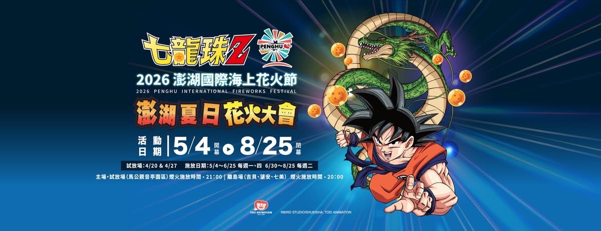 🔥 最強賽亞人降臨! 2026年澎湖國際海上花火節與《七龍珠Z》聯手,打造全台最熱血的《七龍珠Z 澎湖夏日花火大會》。 除了震撼的煙火,更有經典角色的無人機光影秀,帶你重溫那段守護地球的熱血時光!