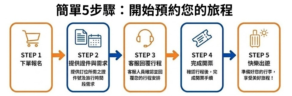 📌【簡單5步驟】:下單報名→提供訂位所需之證件號及旅行時間段需求→客服回覆行程→完成開票