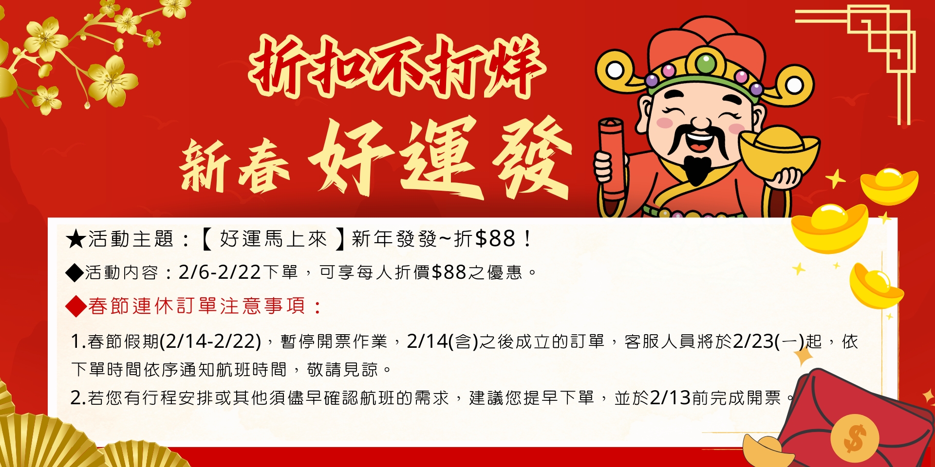 📌本網頁為「計畫旅遊套票」預約申請,訂單成立不代表訂位成功。實際位子需以客服人員回覆確認為準。若航班額滿或訂位未成功,預付之作業金將全額無息退費。