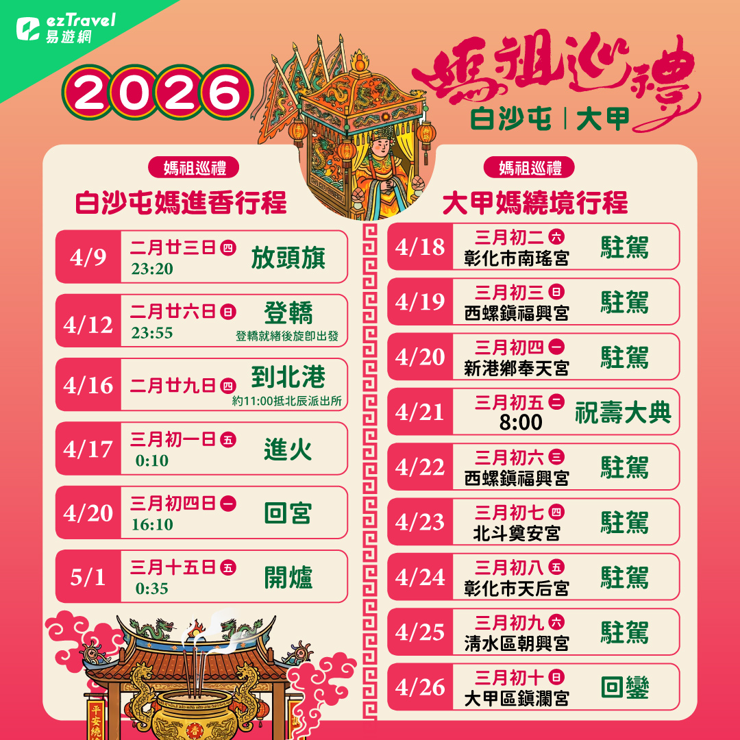 熱門行程: 通常包含第一天起駕、或中部重要駐駕點(如沙鹿區觀音亭、彰化市區等)。