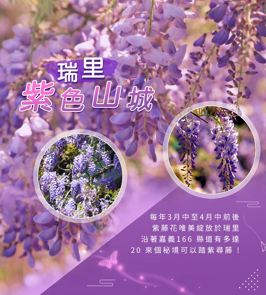 阿里山梅山鄉瑞里村的紫藤花季,從166縣道的71K至80K沿途都可以觀賞到紫藤花,美麗的山城中盡收絕美的紫色花景,還可感受環山山景、滿滿茶園,旅人可輕鬆漫步於春天宜人的紫色時光中。
