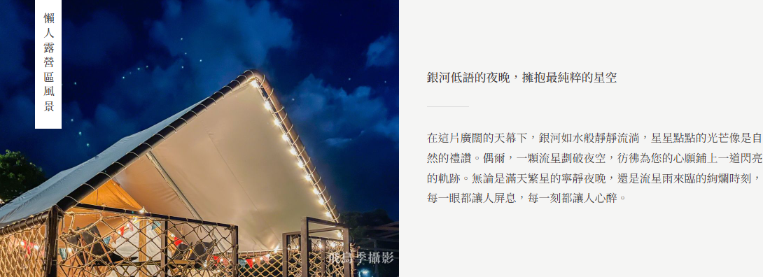 *帳篷備品:冷暖氣機、除濕機、電風扇、桌燈、鏡子、掛衣架、浴巾、電熱毯、液體電蚊香、耳塞、吹風機、帳內獨立衛浴*