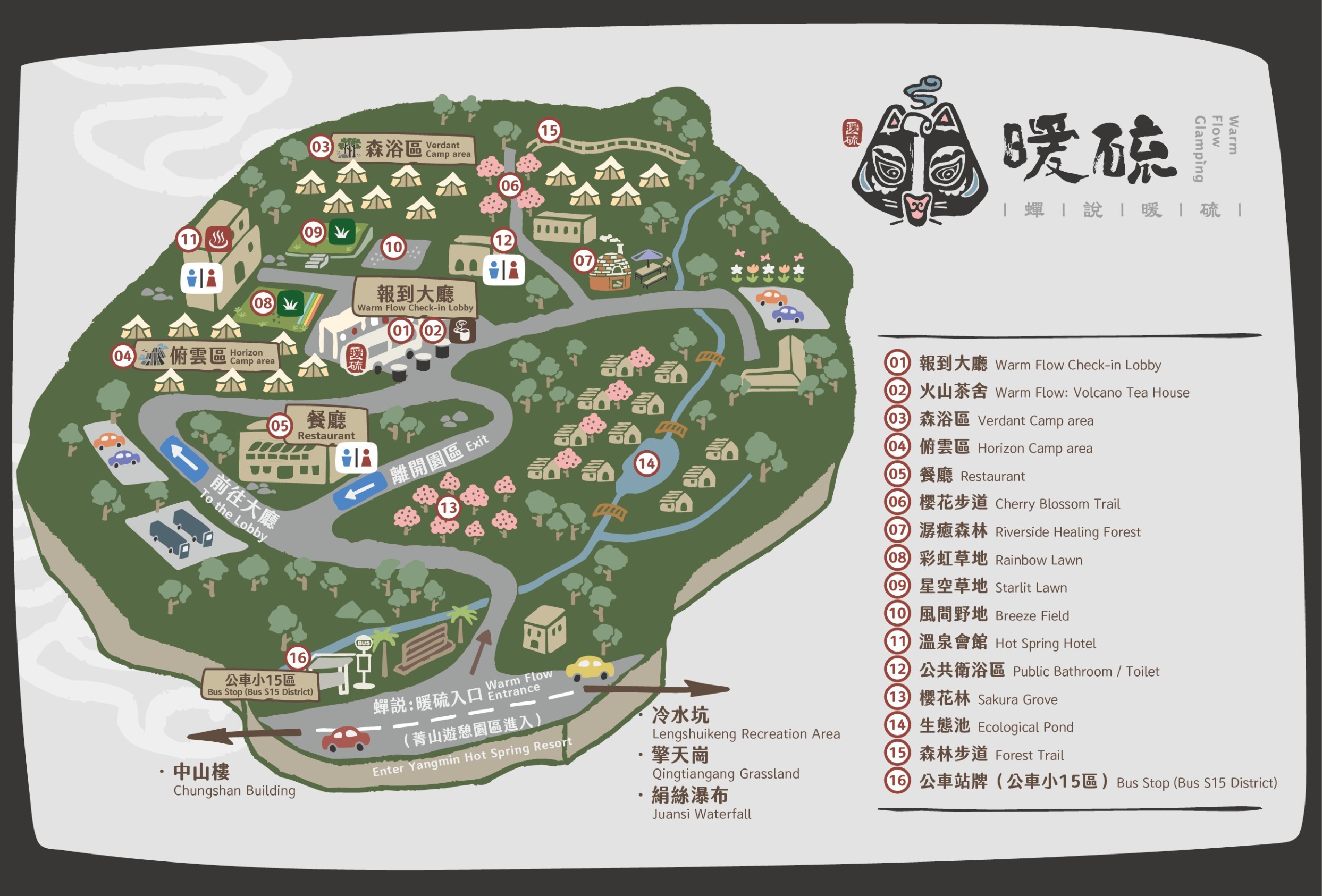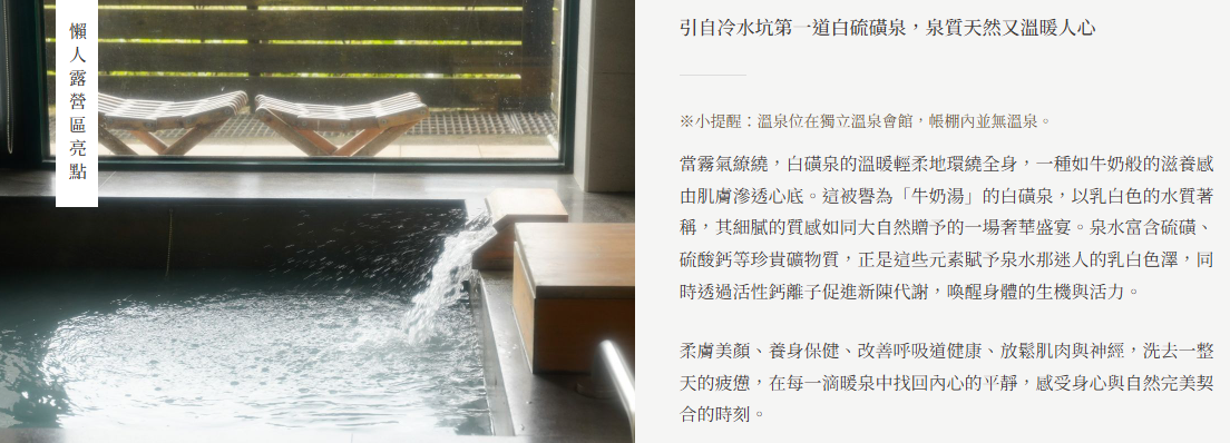 關於暖硫:《蟬說》全新溫泉懶人露營區,在陽明山這片擁有百年溫泉文化的山林之間誕生。融合陽明山的自然地理與人心的沉靜,「暖」代表溫泉的擁抱,每位旅人到訪時心中感受到的陣陣溫暖;「硫」象徵陽明山特有的硫磺泉,同時也意味旅人沉浸於「心流」狀態的極致放鬆。當旅人們置身於這片溫泉霧氣中,空氣裡流動著自然的氣息,心靈也隨之流淌至深處,達到徹底的放鬆和平靜。「白鼻心」是陽明山特有種動物,體態輕盈,行動間帶著一份靈動與靜謐,與陽明山獨有的自然意境相互呼應。作為《蟬說:暖硫》的品牌象徵,白鼻心提醒著每一位旅人:放慢步伐,與自然共生,細細品味山林間的寧靜與美好。