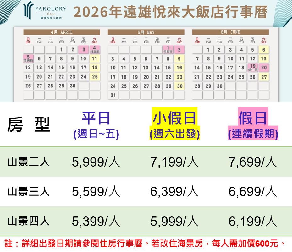 - 雙人房餘10位5,999/每成人