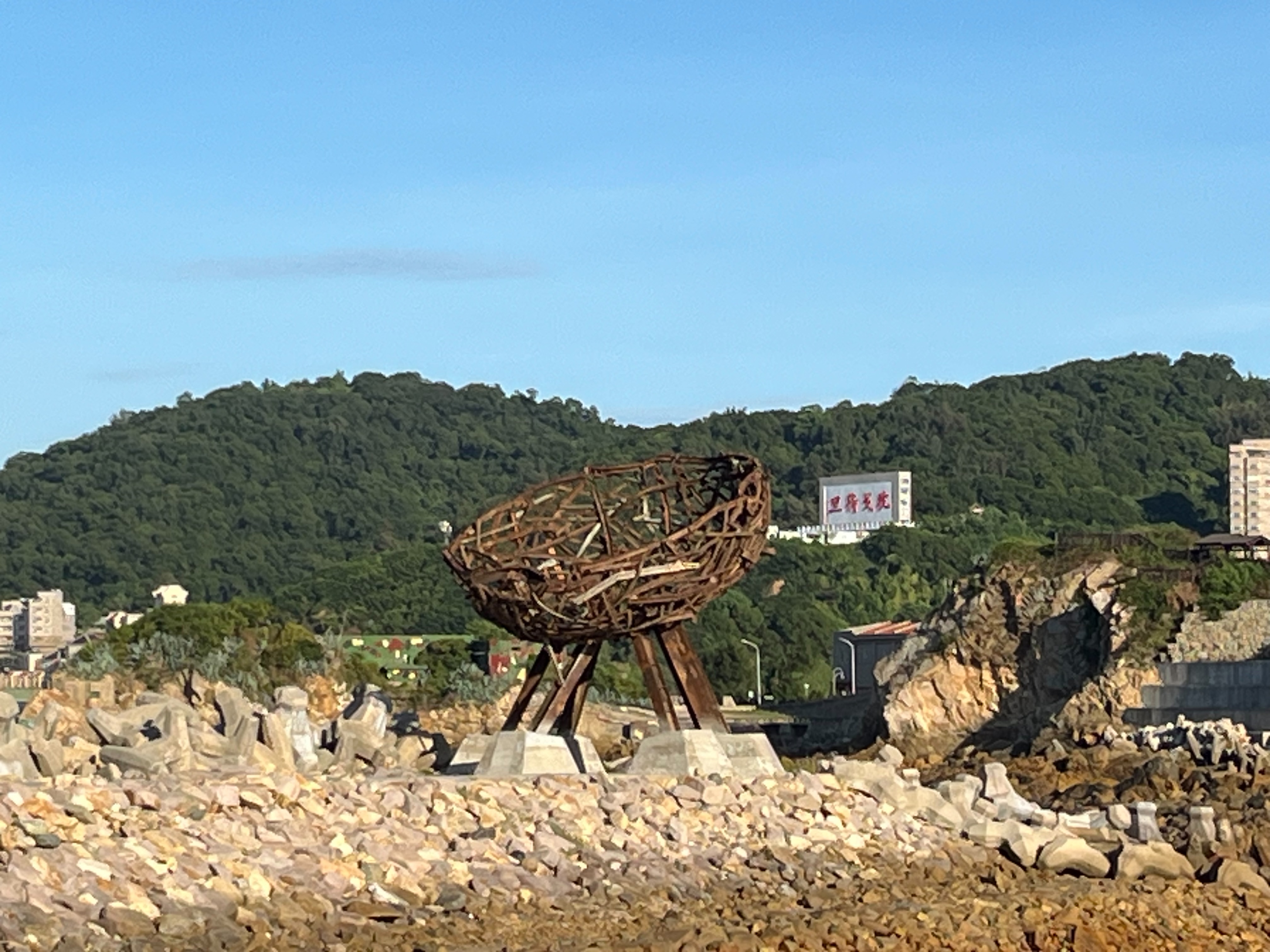 以遠方刻有「枕戈待旦」的巨大石牌為背景,馬祖雕塑家陳益輝在海灣創作大型地景《築巢》,將過往軍事防禦工事中的「軌條砦」,轉化為馬祖人在時代動盪中求安居樂業、築起巢穴的生活想像