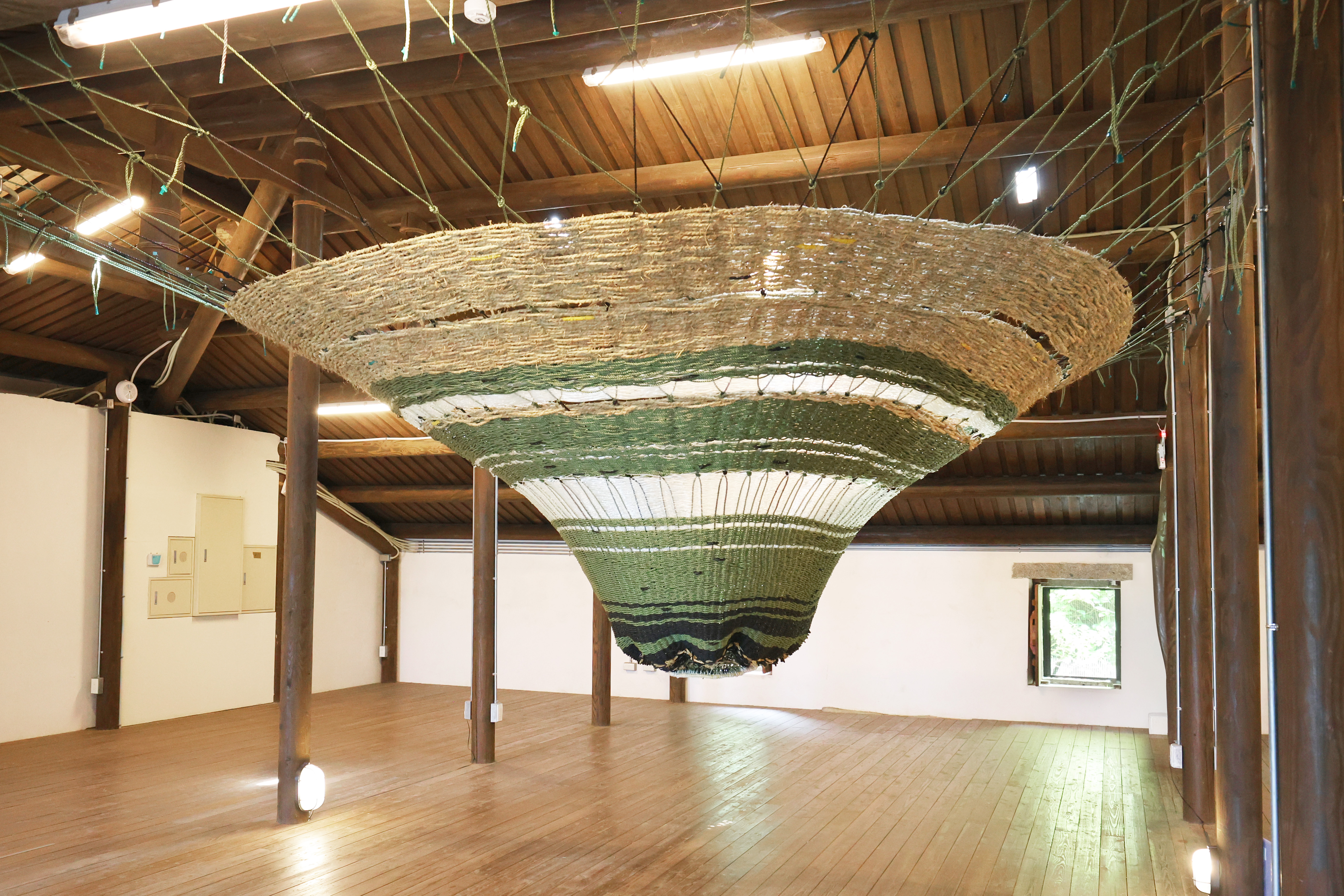 則以草繩編結打造巨大漏斗狀的網,黑、白與綠交織的色彩源自在地漁民常用的漁具,四周木樑柱則如拍楸時眾人打入海底的樁,藉作品與場域互動,再現拍楸文化中的物質符號與手工痕跡。