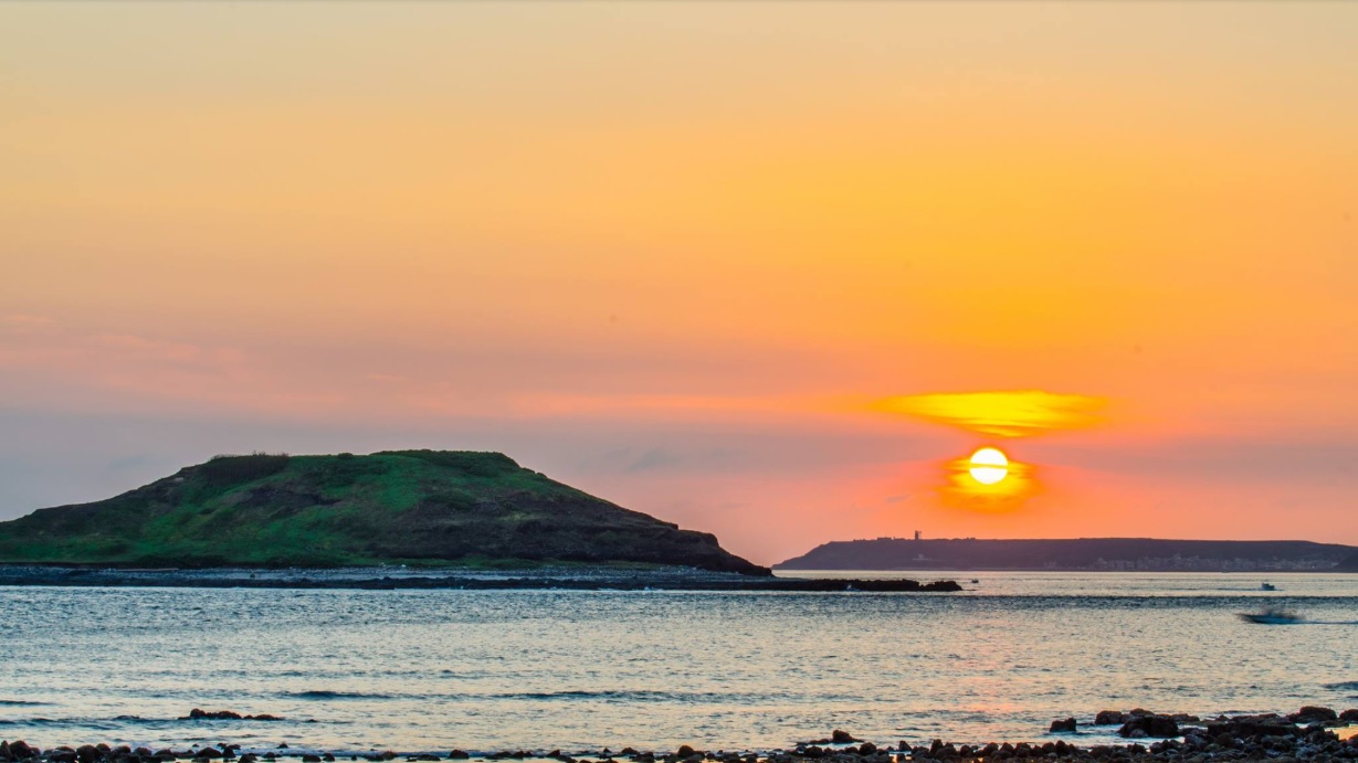 當太陽緩緩降至海平面,金黃光芒灑在西嶼與對岸島嶼之間,海天一色,視界極其開闊;在航行中觀賞西嶼與馬公本島(虎井、桶盤)在夕照下的剪影,層次分明且浪漫。