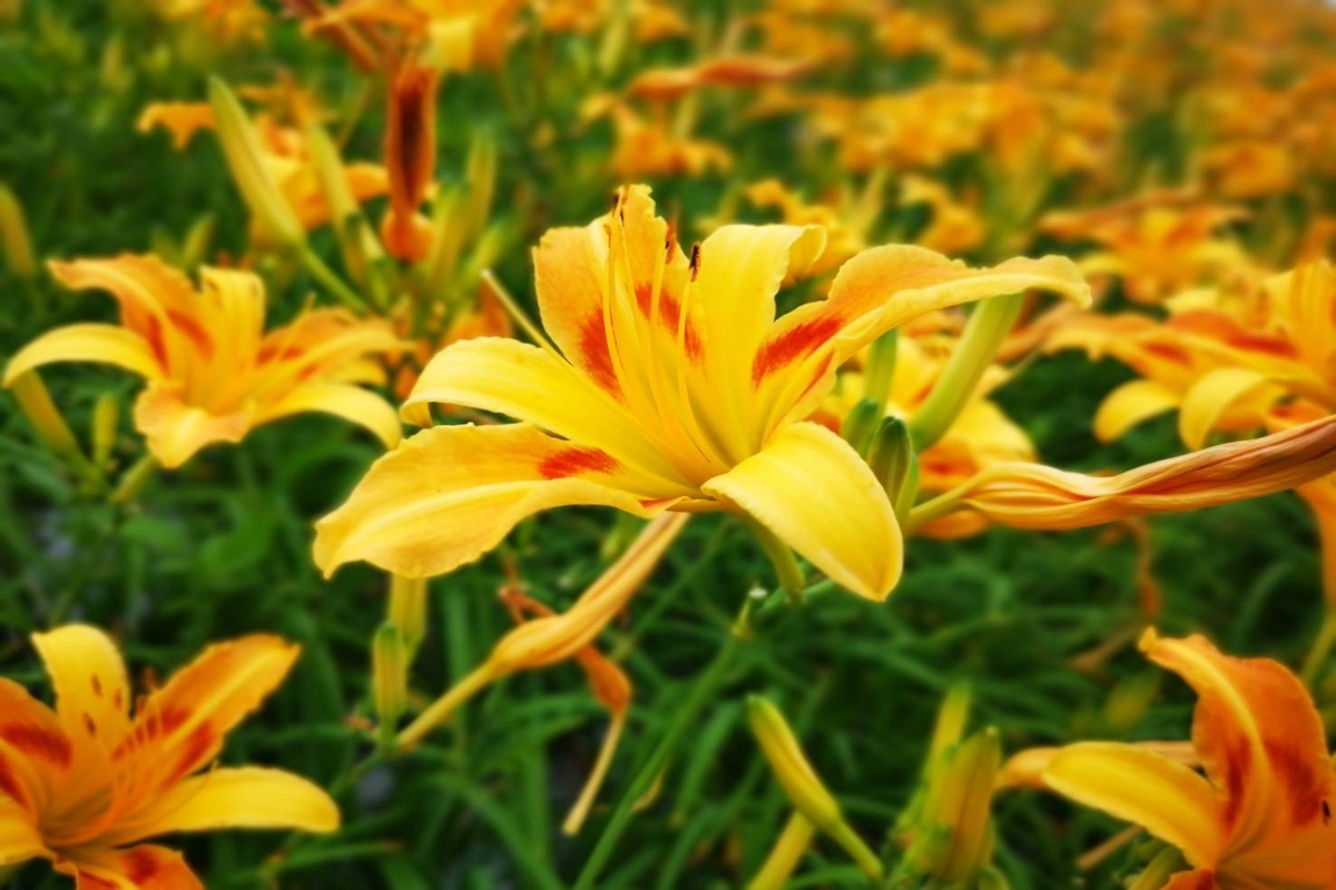大湖溪畔的堤防上,長度將近一公里的斜坡種滿了台東5號金針花,金黃色澤的花瓣帶著條狀深紅,綿延800公尺的金黃地毯,非常壯觀,美得不可勝收。