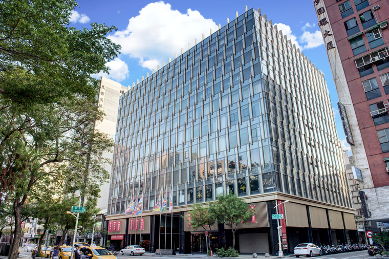 飯店外觀採用大面透明玻璃搭配長條束光燈管,營造科技感與夜晚視覺亮點。客房設計現代、浴室為乾濕分離設計且室內空間規劃良好。