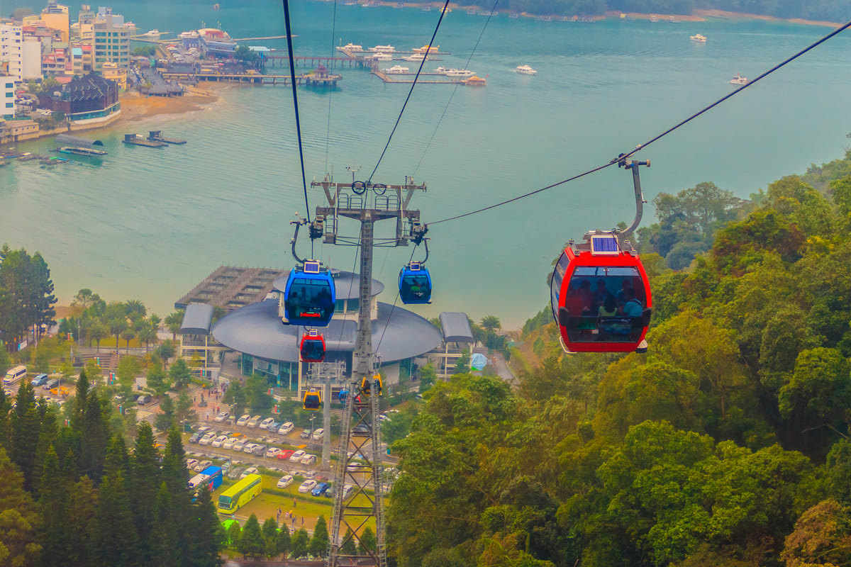 日月潭纜車連結了日月潭的伊達邵和九族文化村,纜車上可一覽日月潭的米其林三星級湖景,欣賞群山環繞、吹著徐徐微風,非常值得一遊。搭乘纜車途中,可鳥瞰著名的日月潭景色和魚池、埔里高山盆地群,還有遠眺日月潭越界引水工程奇蹟的日月湧泉大竹湖入水口,飛越微笑山谷,帶你在10分鐘的空中旅程中看遍日月潭湖光山色、地理景觀和水文,還有四季的晴雨煙雲。