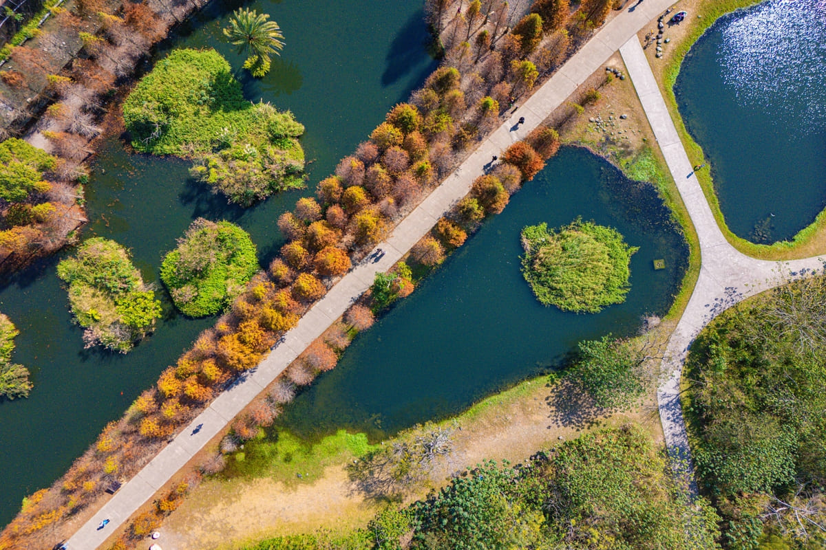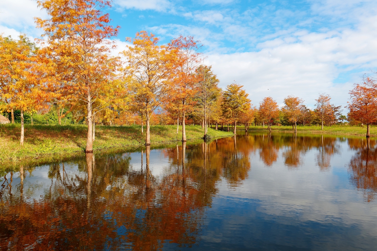 秋冬最浪漫的季節畫布,每到深秋初冬,桃園大溪的月眉落羽松秘境,總會悄悄染上一層繽紛的色彩。翠綠的枝葉漸漸轉為金黃、橘紅,再到深褐,宛如大地鋪上的油彩畫布,將整片田野妝點得夢幻而浪漫。