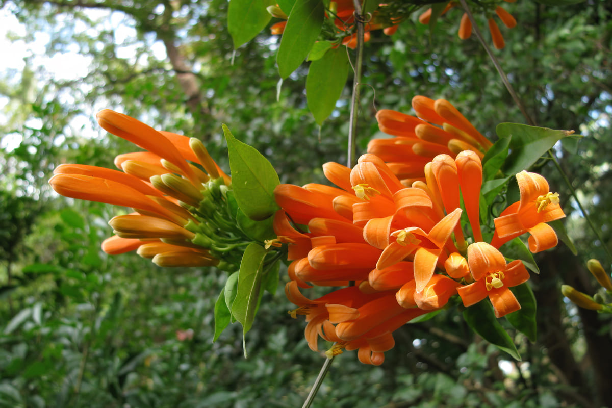 炮仗花每一花序約有20-30朵花,先後開放,花期大約可達一個多月左右。數以千計的花苞及花朵聚集在一起懸掛在花絲上,遠看很像金色的雨絲,炮仗花又有一美麗的別名叫「黃金西北雨」。