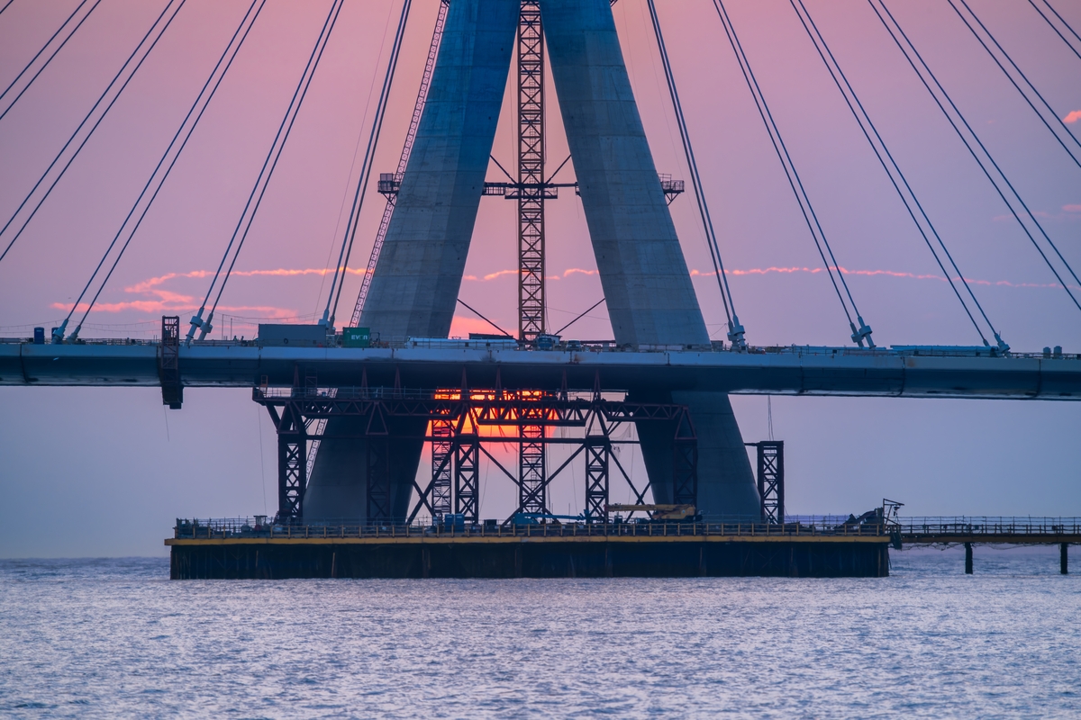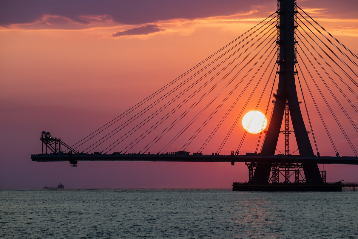 淡江大橋所在淡水河口夕照為台灣八景之一,淡江大橋橫跨淡水河口,全長近920公尺,塔高211公尺,採單塔不對稱斜張橋設計,是世界最長跨距同型橋梁,預計2026年5月通車,串連淡水與八里。